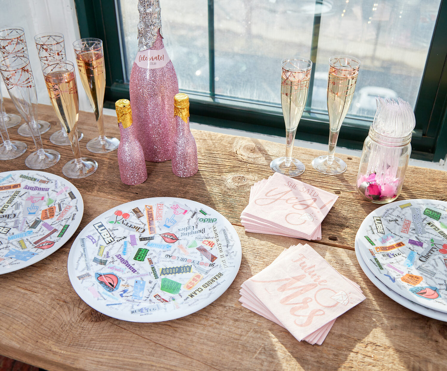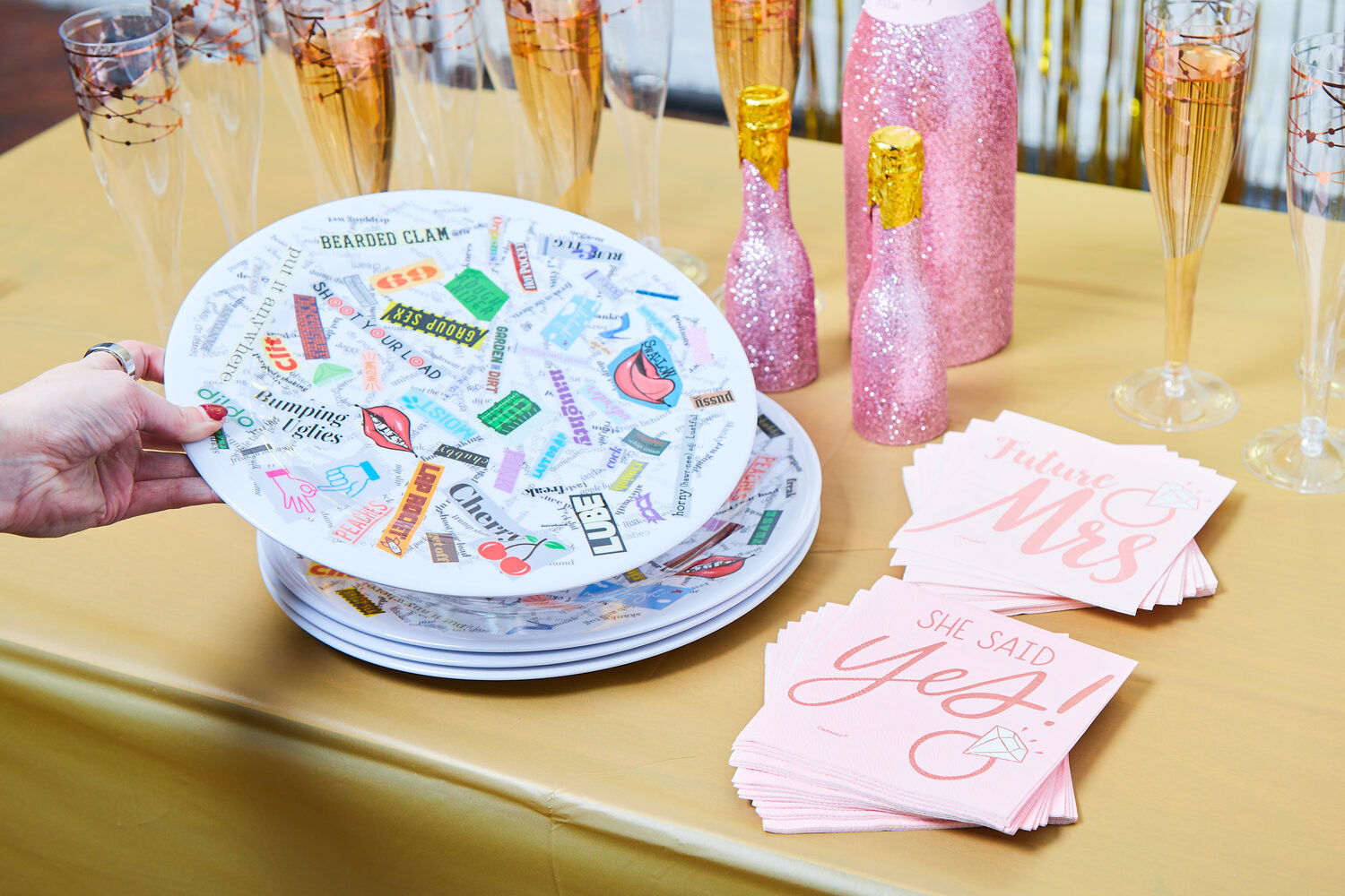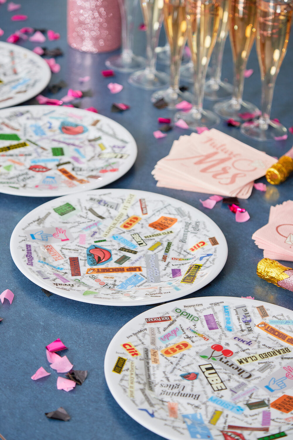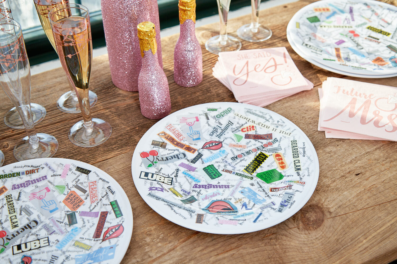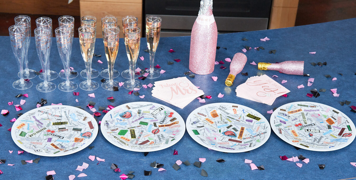 Take your bachelorette party to the next level with Dirty Dishes™️! What better way to enjoy girl-time than eating great food, drinking your favorite drinks, and laughing as you find new words and phrases on your dinnerwear?!